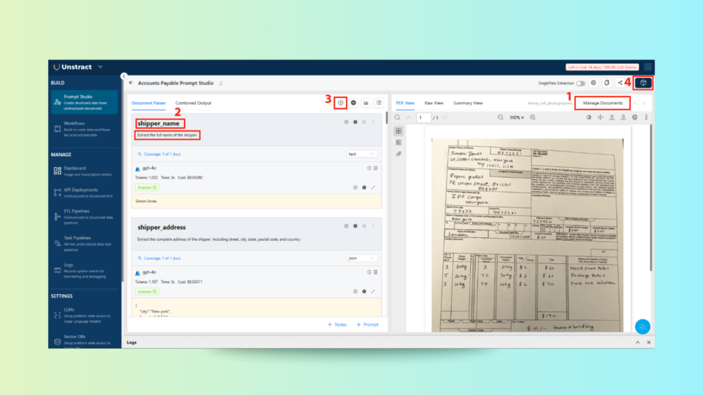 One of the core strengths of Unstract as an intelligent document processing platform is Prompt Studio—a no-code interface designed to help you extract structured data from complex, multi-format business documents like invoices, remittance advices, and air waybills. With just a few clicks, you can turn unstructured PDFs into clean JSON output, ready for system integration.