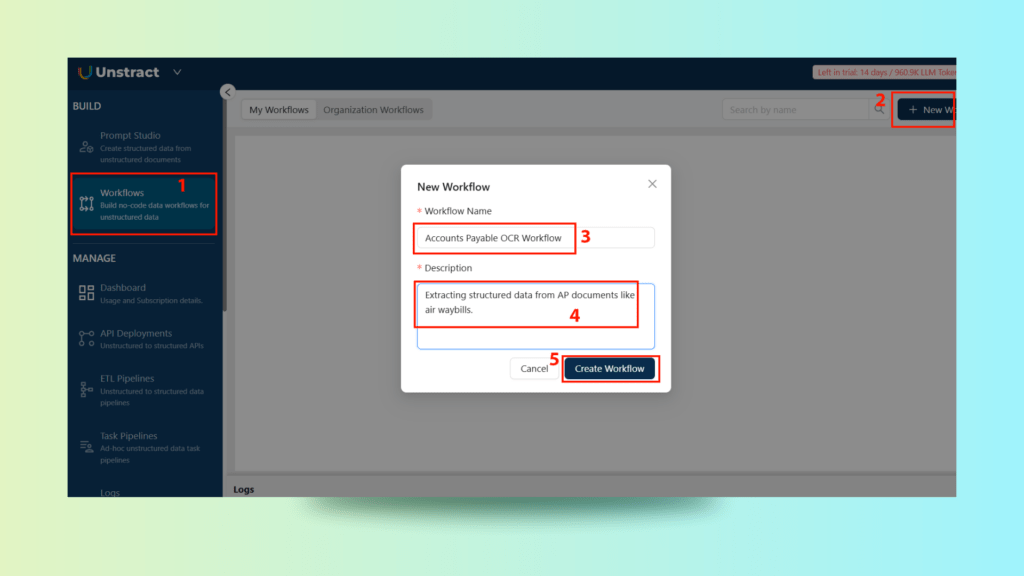 Go to the Workflows tab on Unstract’s dashboard and click New Workflow.