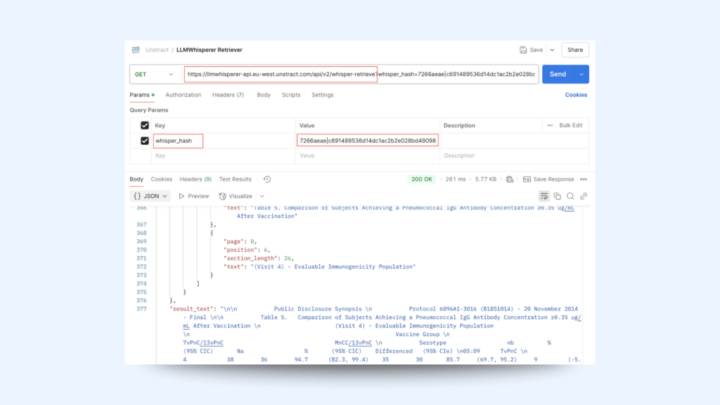 If the status is processed, you can retrieve the parsed output via the Retriever API using the same whisper_hash