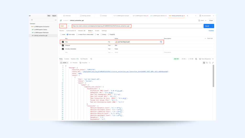 Steps in Unstract to parse clinical/medical reports using LLMWhisperer API (Postman)
