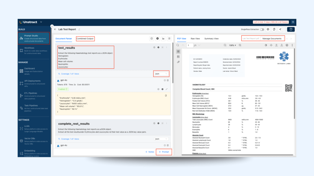 In this context, Unstract plays a crucial role by leveraging advanced, AI-driven Large Language Models (LLMs) to accurately extract structured data from complex, unstructured documents. Unstract significantly outperforms traditional IDP methods, particularly demonstrated through tools like LLMWhisperer and Prompt Studio. These tools excel in capturing detailed clinical information from complex documents and presenting it in structured, easily integrable formats such as JSON, enabling seamless incorporation into existing ETL processes or LLM-based workflows.
