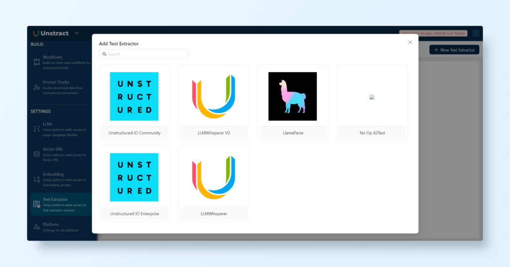 To add your own text extractor, go to SETTINGS → Text Extractor. Here, you can add a new text extractor by selecting ‘+ New Text Extractor’: