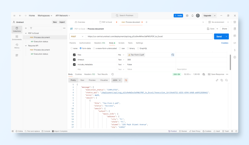# Process the PDF file using the Unstract API and return the output in JSON format