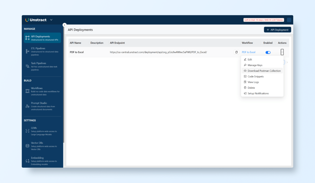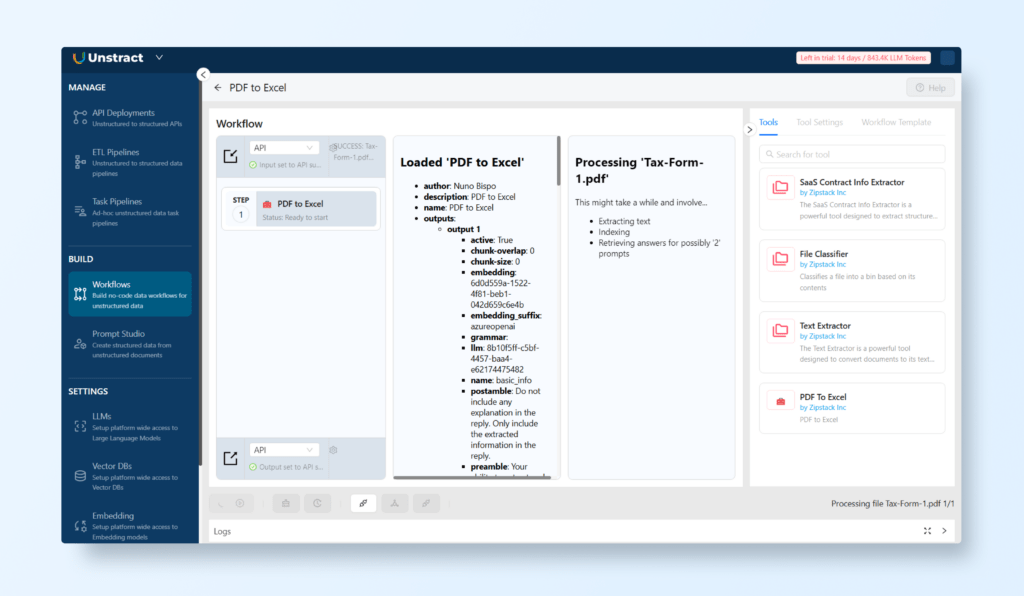 Can I convert PDF to Excel in bulk and serve the results from an API? Yes. After refining your prompts, you can export the project as a “Tool,” wrap it in an Unstract Workflow, and then deploy it as an API. The API accepts multiple PDFs and returns structured JSON that can be instantly converted to Excel files by writing custom Python scripts.