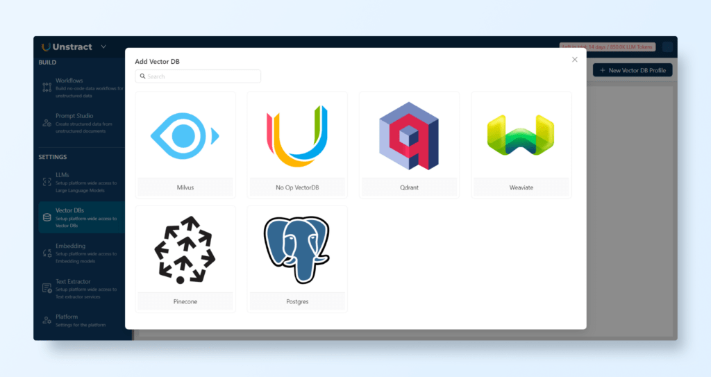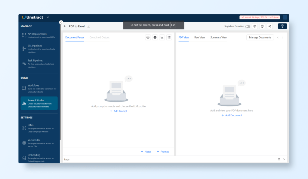 You are now ready to start exploring the Unstract cloud platform. By default, you will land on the Prompt Studio page.If you run out of credits or wish to add your own LLM, embeddings, vector database, or text extractor providers, you can use the various options available in the SETTINGS menu.