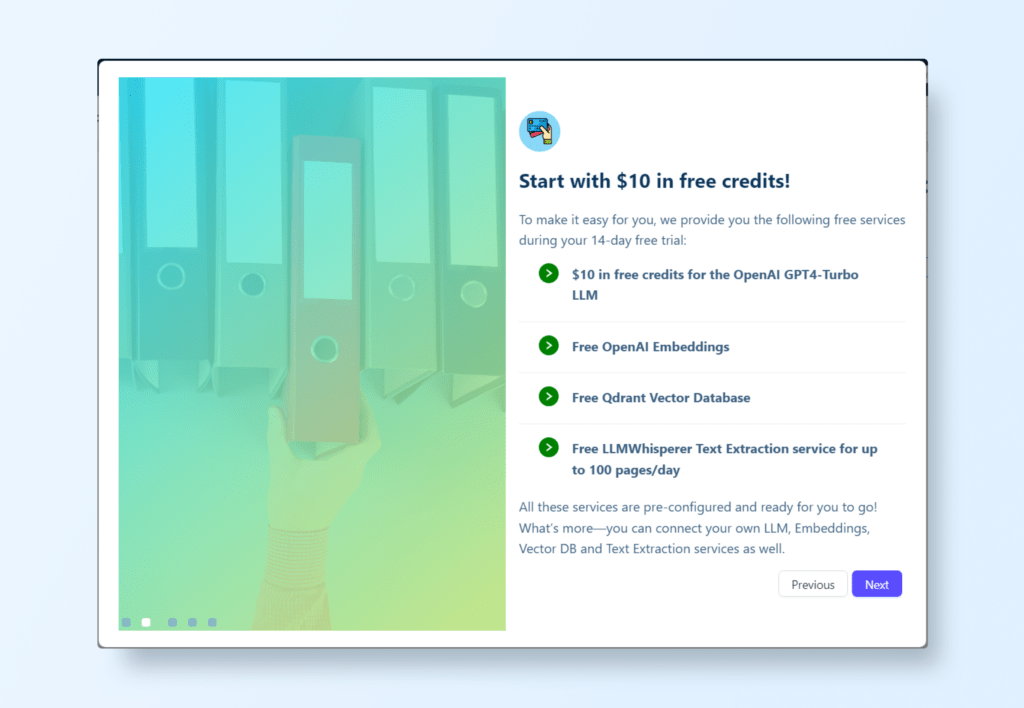 When you first sign up, you will receive a 14-day trial that includes $10 in LLM tokens, allowing you to start using the account immediately: