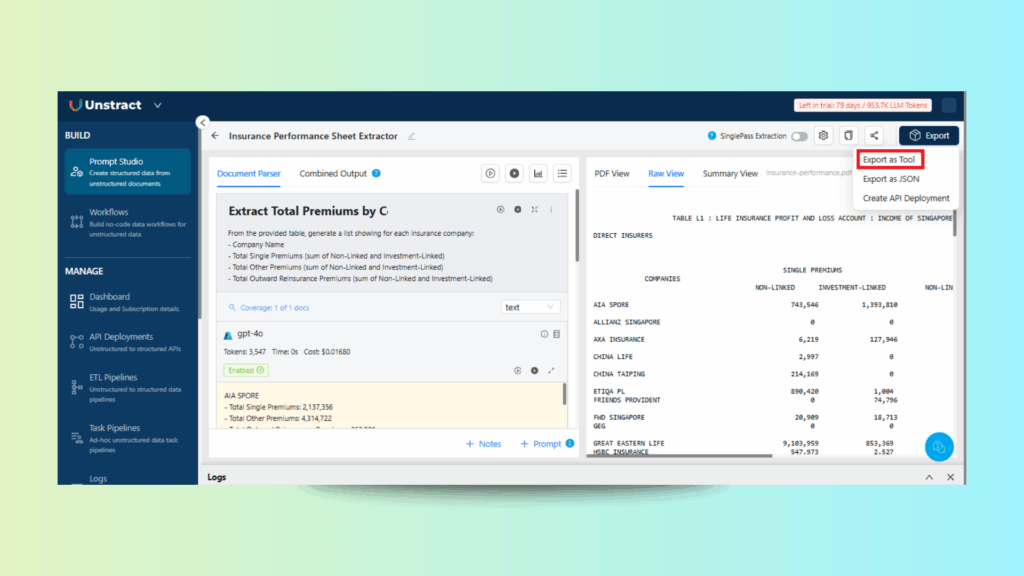 This walkthrough outlines how to build an insurance performance extraction workflow using Unstract’s Prompt Studio and Workflow Builder.