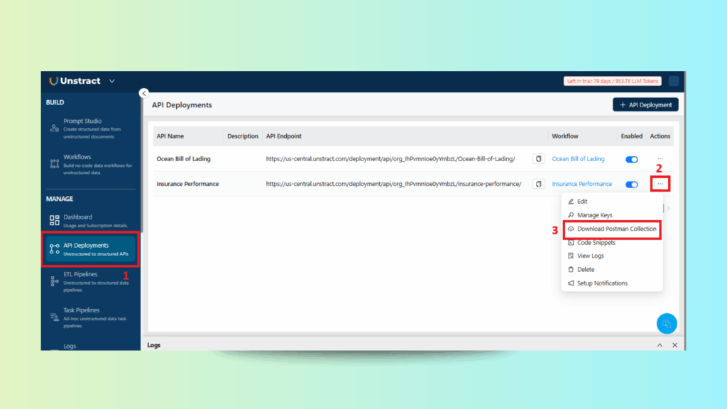 Access the API Keys section in LLMWhisperer and download the pre-configured Postman collection.