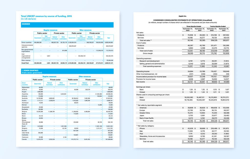 apple.pdf: This document has financial statements from Apple Inc., including tables with different financial data like net sales, cost of sales, and operating income. The tables are well-organized but have a mix of text and numbers, making them a good test for accuracy and handling table structures.