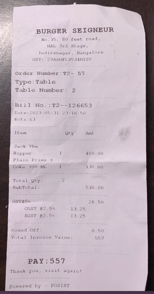 Your ability to extract and summarise this restaurant invoice accurately is essential for effective analysis. Pay close attention to the context's language, structure, and any cross-references to ensure a comprehensive and precise extraction of information. Do not use prior knowledge or information from outside the context to answer the questions. Only use the information provided in the context to answer the questions.