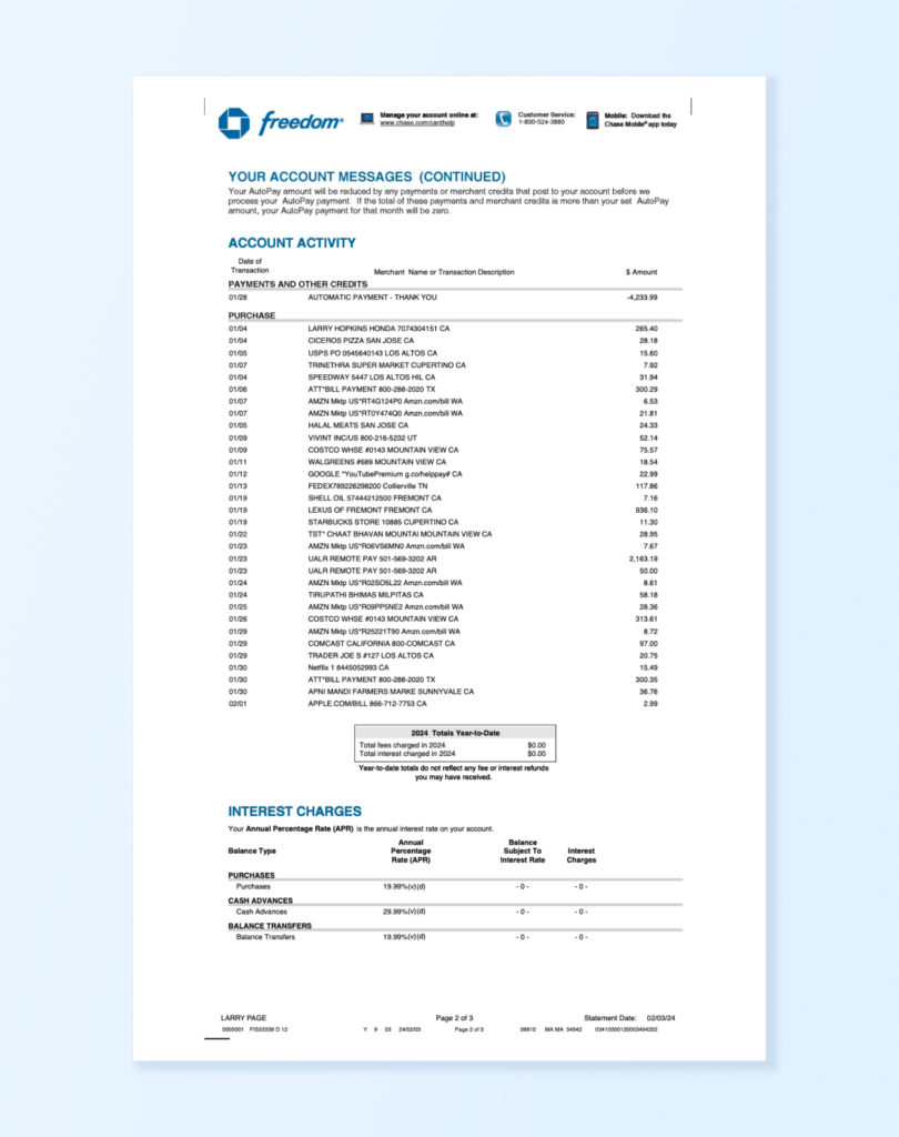 with pdfplumber.open("Chase Freedom Bank Statement.pdf") as pdf: