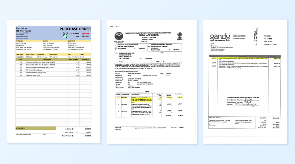 Many organizations still rely on scanned or printed purchase orders. These documents may have: