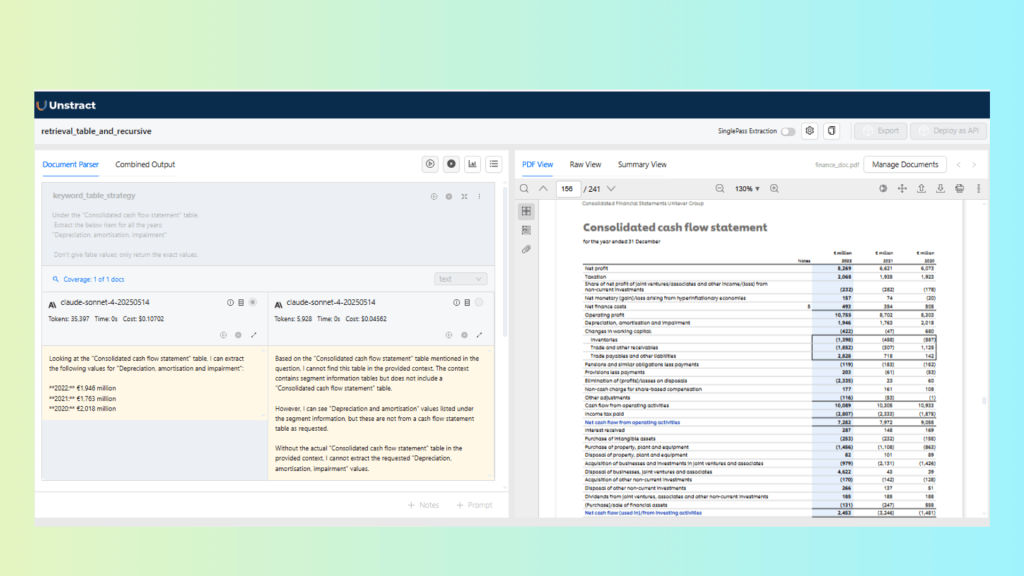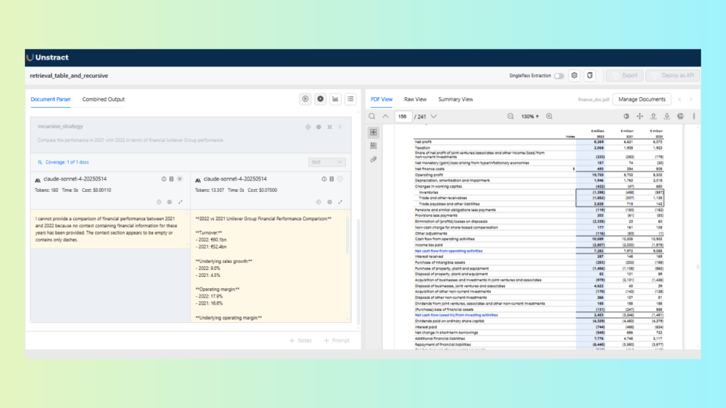 The differences between retrieval strategies become obvious when you test them against real documents. To make this concrete, let’s look at two scenarios of how these strategies impact results in Unstract Prompt Studio, showing how strategy choice changes the quality of extracted outputs, particularly when documents contain a mix of tables, multi-column layouts, and fragmented fields.