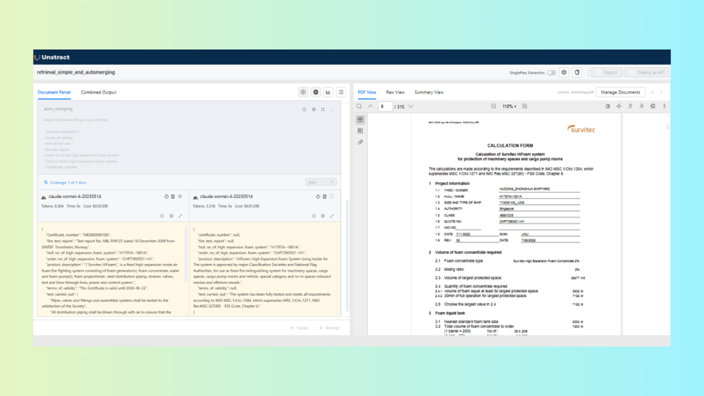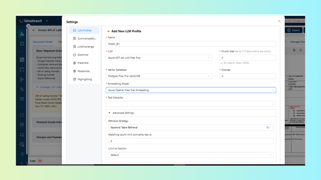 Unstract’s Prompt Studio allows users to create custom prompts and select retrieval strategies through configurable LLM Profiles, allowing the extraction of specific fields from complex documents.