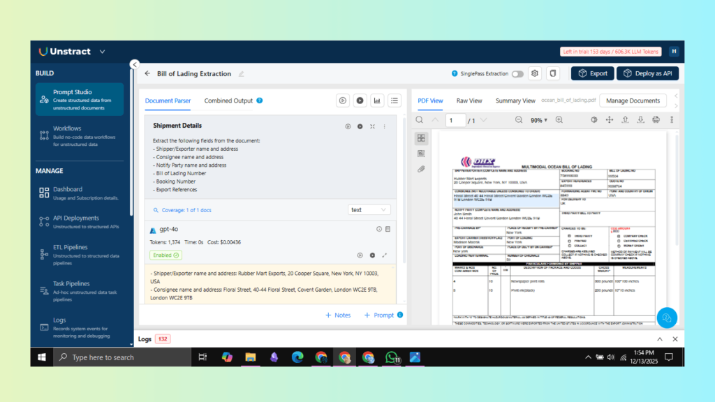 - After validating the extraction performance, Unstract allows you to deploy this workflow as a secure API, making it easy to integrate with Enterprise Resource Planning (ERP) systems, shipping management tools, or logistics platforms.
