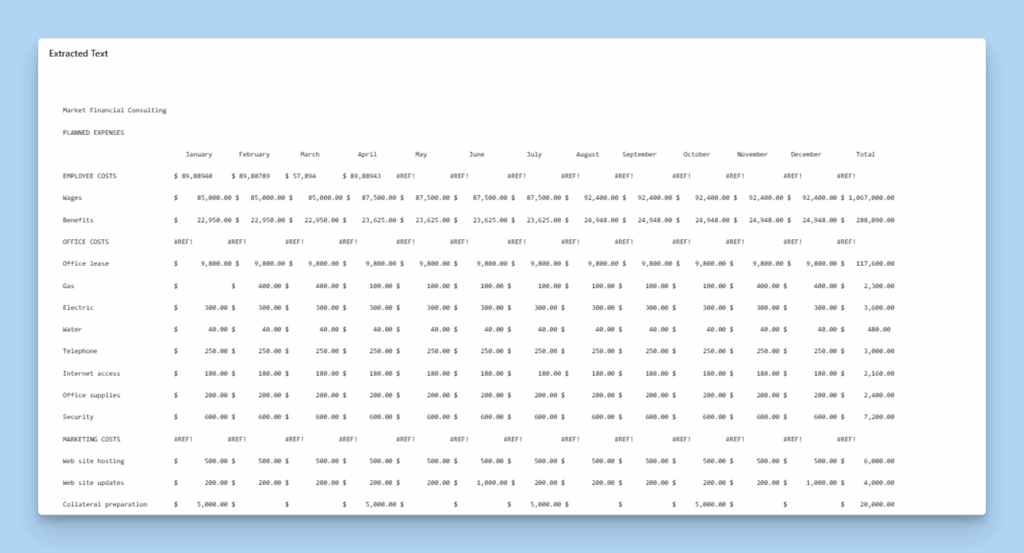 Business expense reports exported from spreadsheets often lack consistent formatting. When exported to PDF or image format, rows may be merged, notes misplaced, or categories misaligned, which makes automated processing difficult.