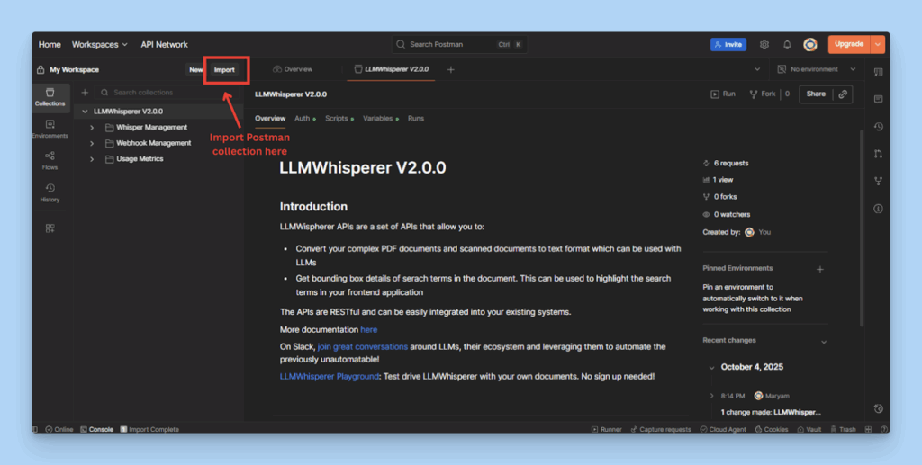 The LLMWhisperer API gives developers full control. Document files can be sent via API calls, returning structured outputs such as JSON that connect seamlessly into downstream systems. This approach is ideal for teams embedding OCR into custom apps, such as ERPs or analytics platforms.
