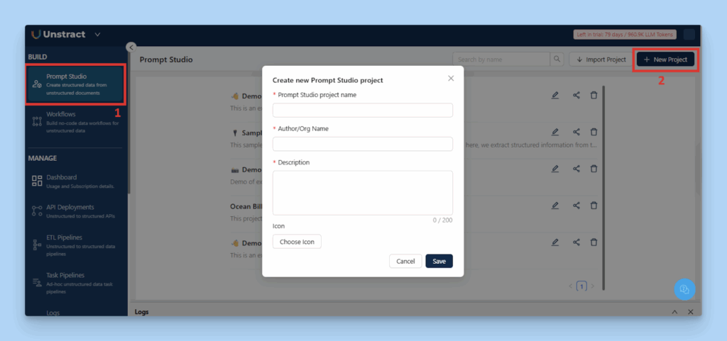 In Unstract’s Prompt Studio, start a new project for the tax form.