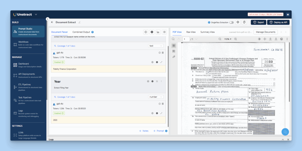 For this demo, let’s use Unstract’s Prompt Studio to extract data from a scanned handwritten tax form.