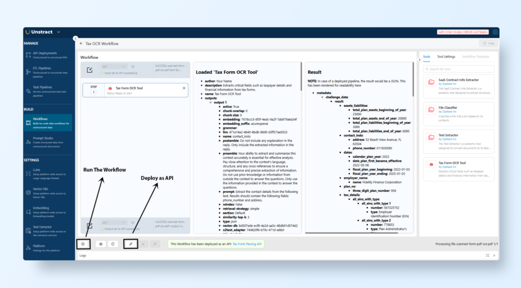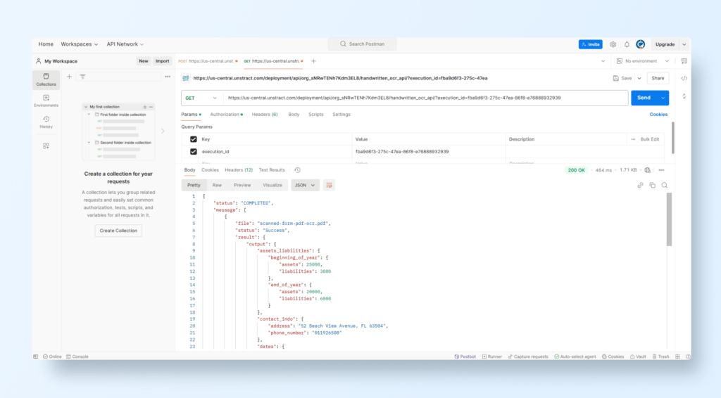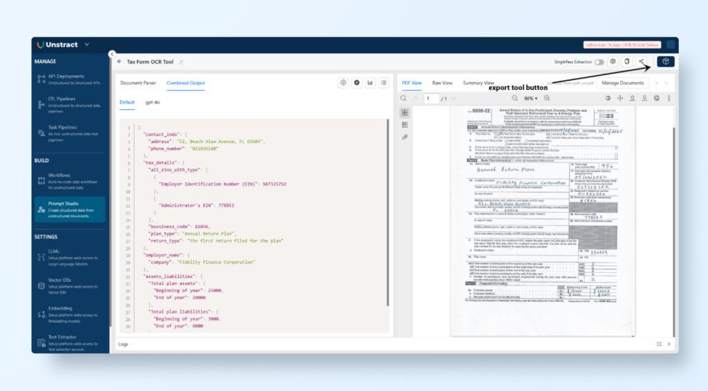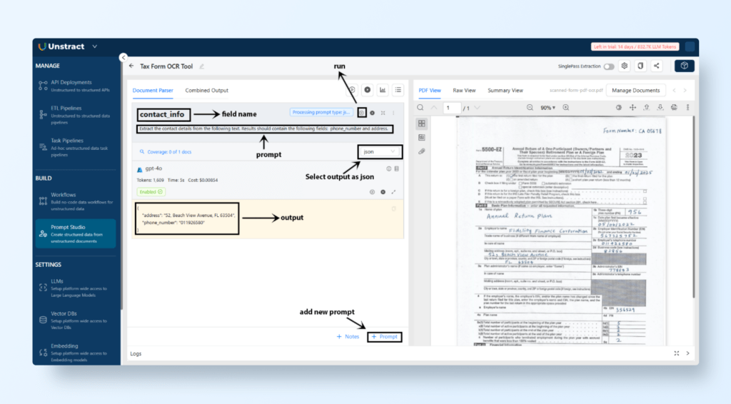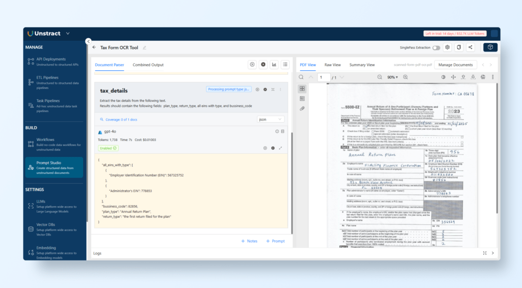 Extracting structured data from scanned handwritten tax forms is a crucial step in automating tax reporting and compliance workflows. Using Unstract’s Prompt Studio, organizations can tailor prompts to extract critical information such as the taxpayer’s name, total assets, and employer details. Here’s a detailed guide to setting up Unstract to process a scanned handwritten tax form, complete with API integration via Postman.