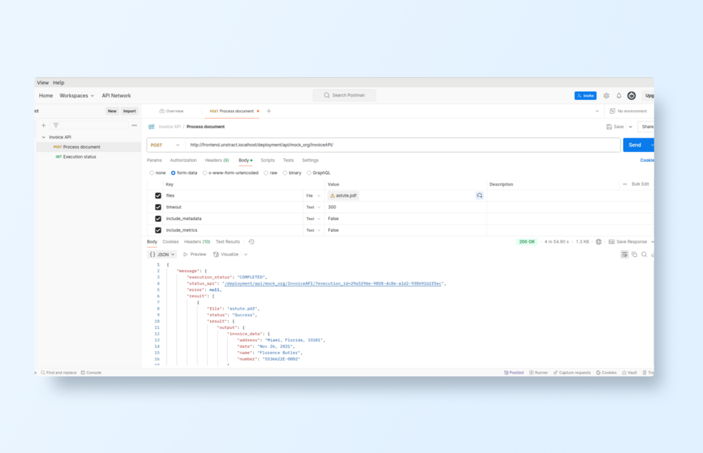 Send a Request – Choose an invoice file, run the request, and review the extracted data.