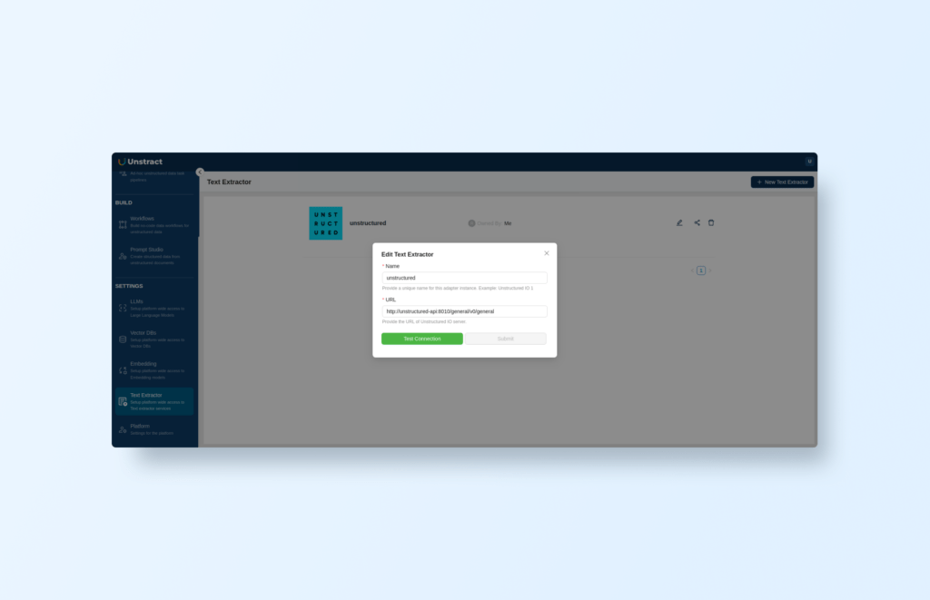 In Unstract’s configuration, go to ‘SETTINGS->Text Extractor’, add a new text extractor, select Unstructured community, and set the URL: