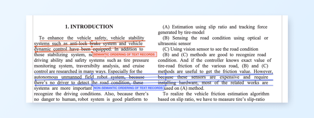 In the example shown above, text records can be organized in a semantically correct order as shown in the red lines. But in some PDFs (and all OCR’d documents) text records can be organized in a non-semantic order reading left to right over to the next column before moving to the next line. When text is collected this way, the final text will make no sense to downstream pipeline steps. We need smart ways to reorganize such text to make semantic sense.