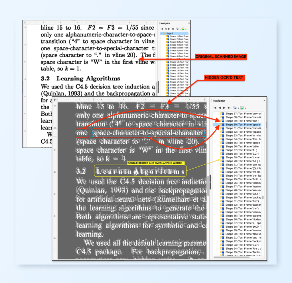Another example is the text “Learning Algorithms” in the figure above. This title text is not only split into two words but since the size of the text is large, the original OCR overlay system has double-spaced the characters (to match location of letters) in the result (take a look at the right pane). There are two records – “L e a r n i n g” and “A l g o r i t h m s”. Again a difficult problem to solve to de-double space the characters when we extract text. There is also a mistake in positions. “Algorithms” has backed into “Learning” creating an overlap. Just everyday difficulties extracting text from PDFs!