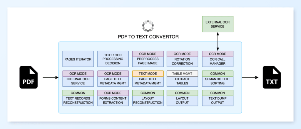 Considering all the cases described above, a block diagram of a high-quality PDF-to-text convertor would look like this:
