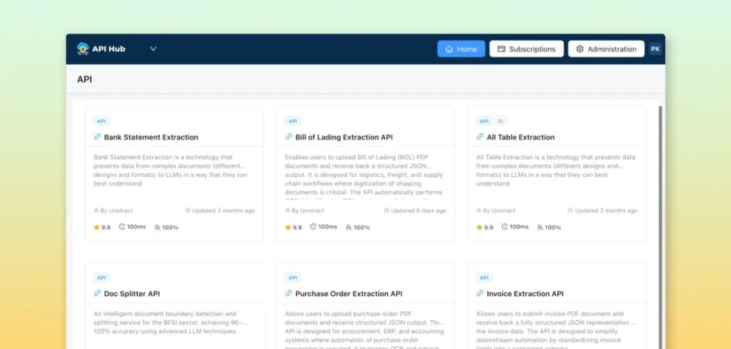 Unstract’s new API Hub helps you skip lengthy development cycles with ready-to-use, plug-and-play APIs for document extraction. Each API is prebuilt and tested to deliver domain-specific structured data from documents like invoices, purchase orders, bills of lading, bank statements, and more.