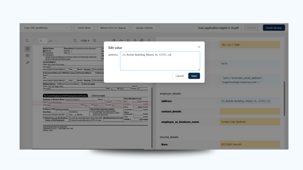 • You can also configure rules for fields that must always be reviewed, regardless of confidence (e.g., Social Security Numbers or Address fields in loan documents).