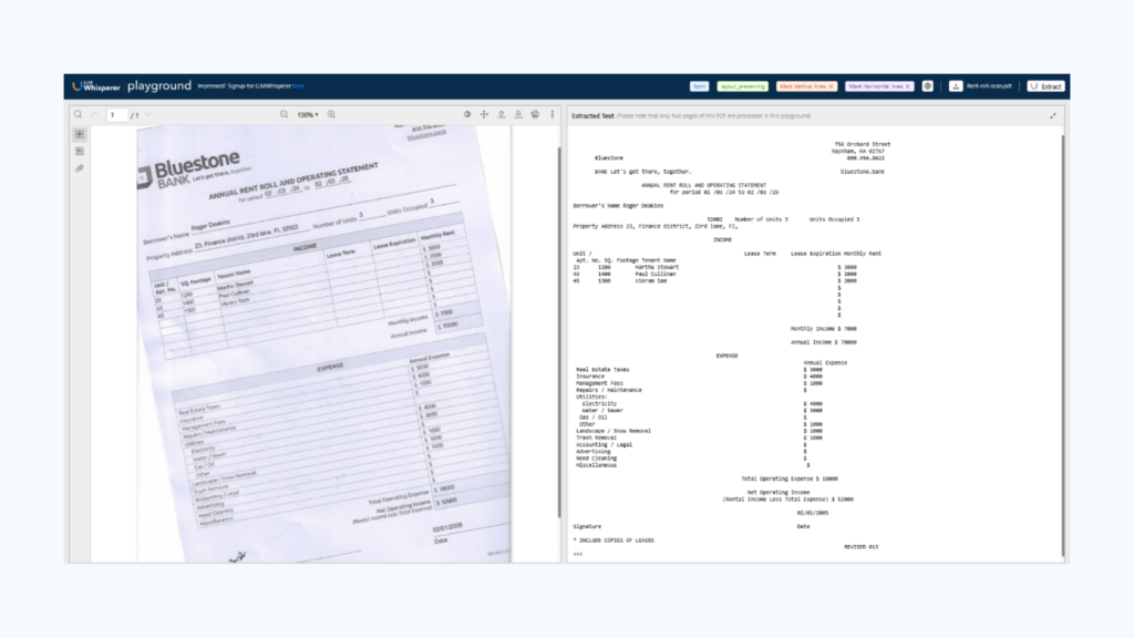 Built-in OCR (LLMWhisperer)Handles low-quality scans, tilted images, handwriting