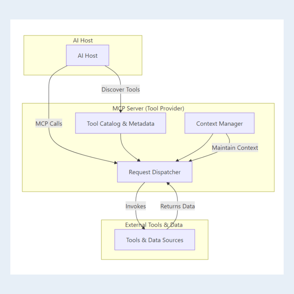 The server acts as the “tool provider,” implementing the MCP specification to expose and execute a catalog of services.