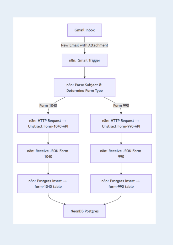 Branching Logic: Parses the subject line to identify “Form 1040” vs. “Form 990” and routes each message accordingly.