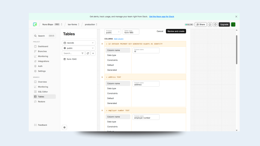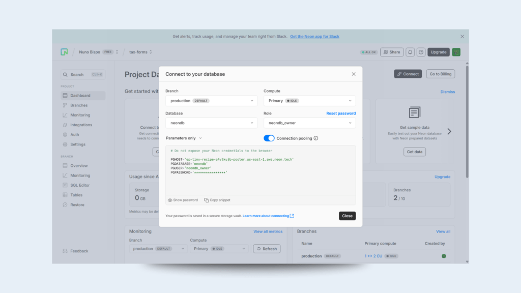 Sign up for a free NeonDB project to create a dedicated database for your tax-form data.
