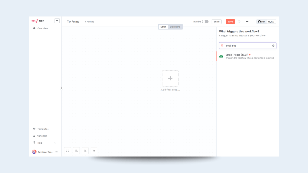 Since this is the first node of the workflow, you can create it by clicking on ‘Add first step’ and selecting ‘Email Trigger (IMAP)’ from the list: