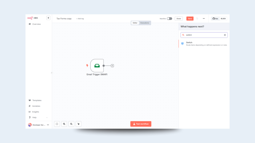 Once you have confirmed that the workflow works as expected you can set to Active so it runs automatically. You can do this by ticking the ‘Inactive’ toggle in the editor to change it to ‘Active.