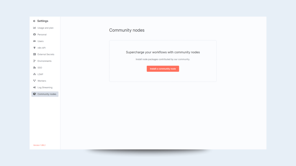 Navigate to ‘Settings’ -> ‘Community nodes’ and click on ‘Install a community node’: