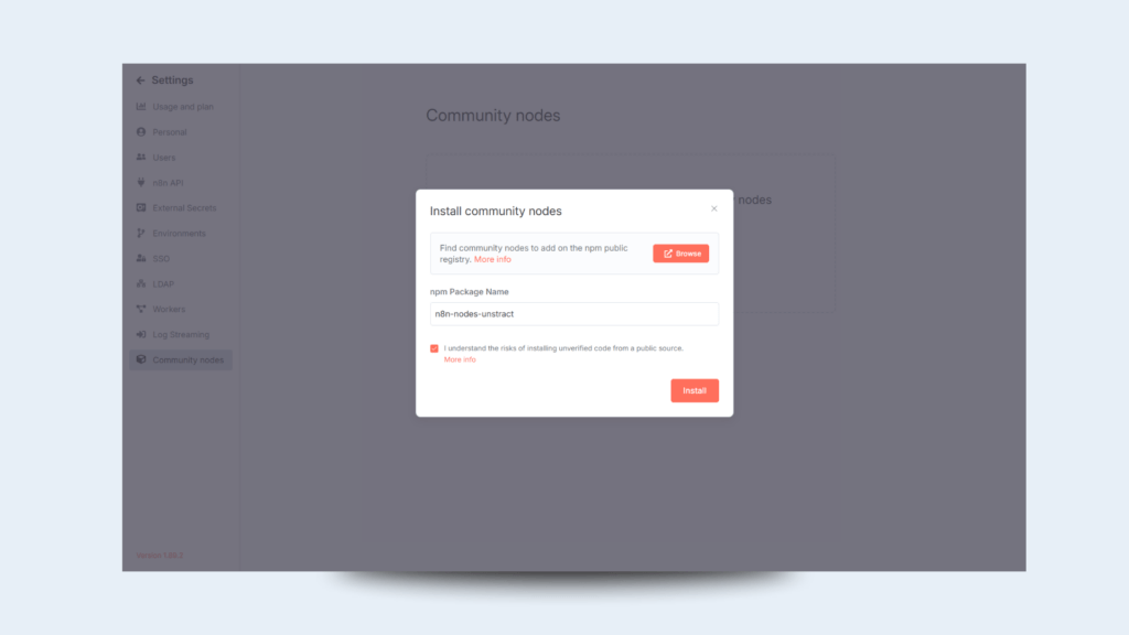 Fill in the npm package name for the Unstract node, n8n-nodes-unstract, and click ‘Install’: