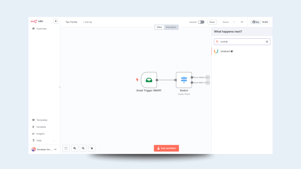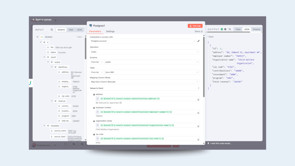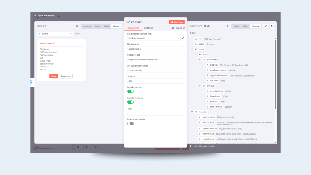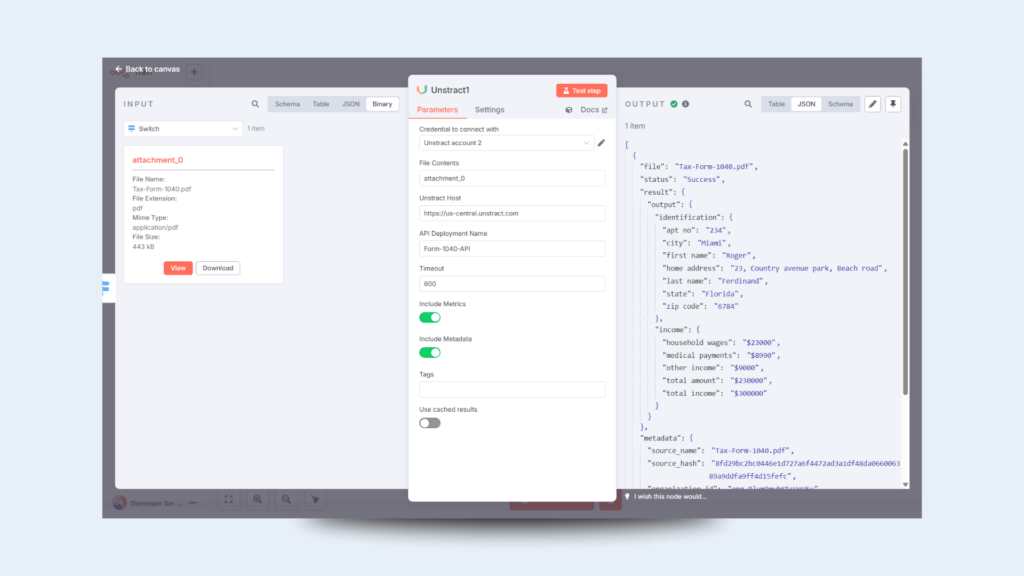 As your document types evolve, you can rapidly iterate on new extractors in Unstract and seamlessly plug them into your existing n8n workflows.