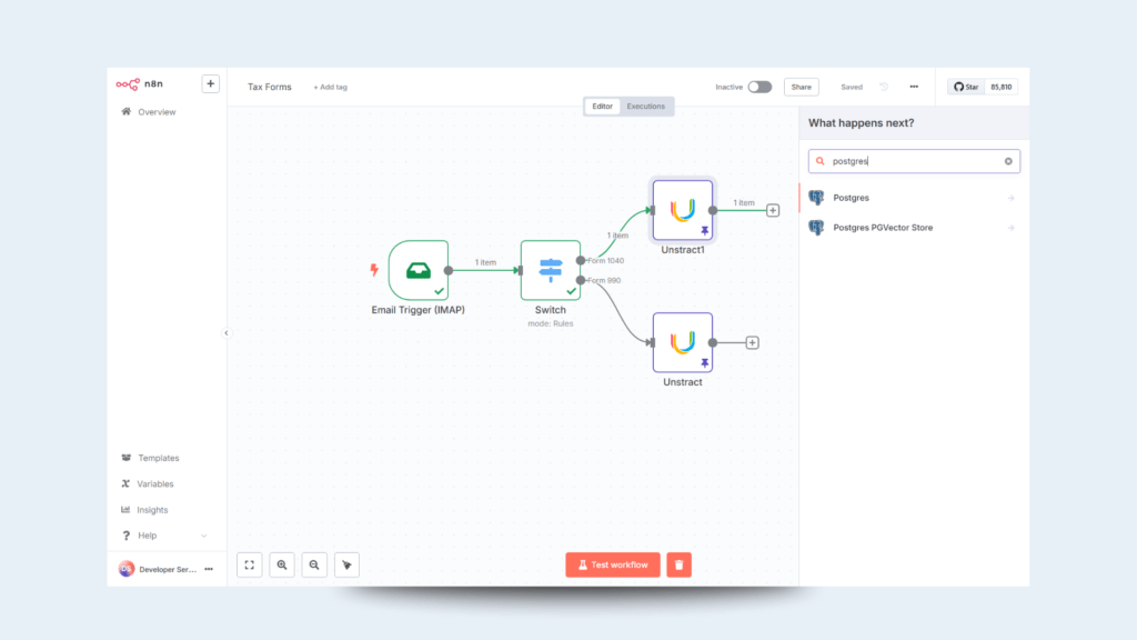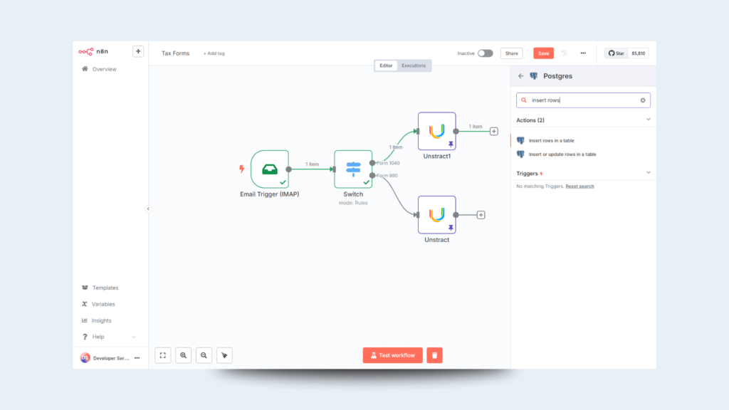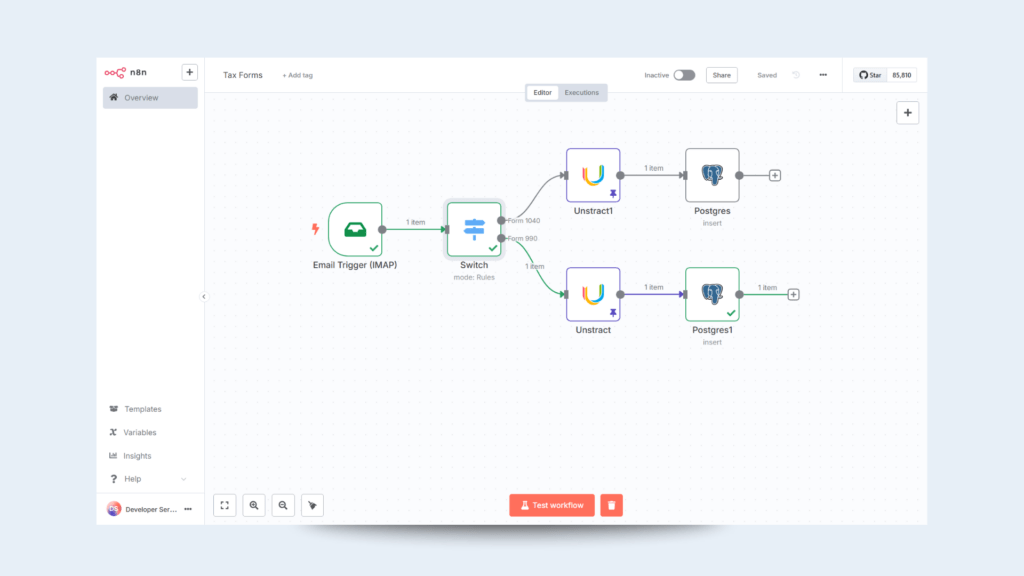 It gets triggered with a new email (read from IMAP), parses the email subject, chooses the appropriate branch, calls the Unstract API, sends the attached PDF, and inserts the JSON output into the corresponding Postgres table.