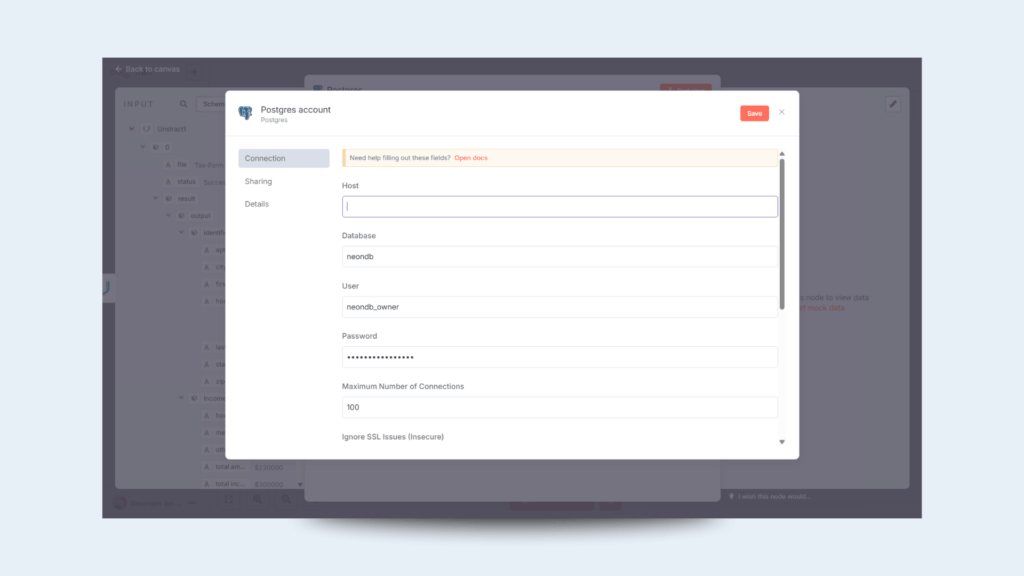 Returning to the workflow editor, the next step is to configure the output of the Unstract APIs to a Postgres node.
