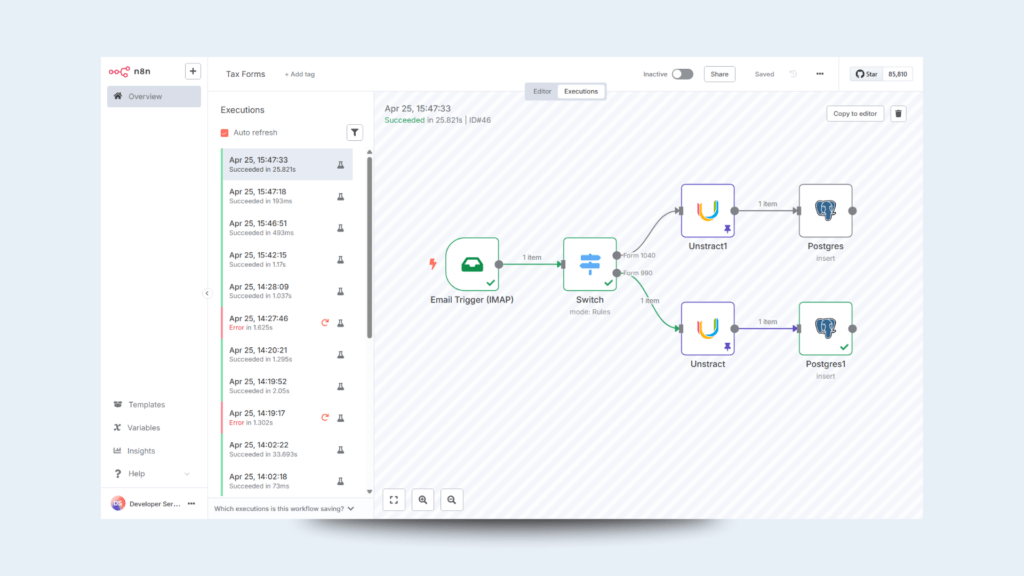 With n8n’s powerful branching and retry capabilities, you can filter incoming emails, parse subject lines to identify form types, and route attachments through the appropriate processing paths, all under your data governance.