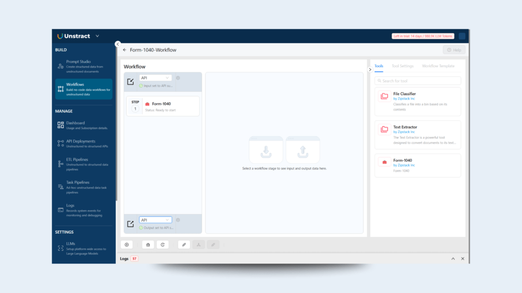 Then, in the Tools section on the right, locate the tool you just created (e.g., “Form-1040”) and drag and drop it into the workflow editor on the left side: