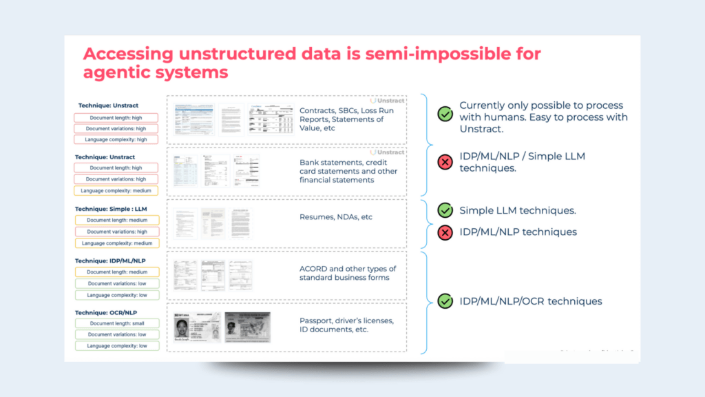 Unstructured data comes in many varieties. Incumbent technologies like OCR, NLP, ML, CV (Computer Vision) and IDP (Intelligent Document Processing) struggle only when the language gets very complex or when the document variants are a lot to deal with. But, where they work very well, solutions like Unstract that are LLM-native might struggle to meet cost and latency requirements. When customers are happy with results from systems that use incumbent tech, we advise them to continue using it.