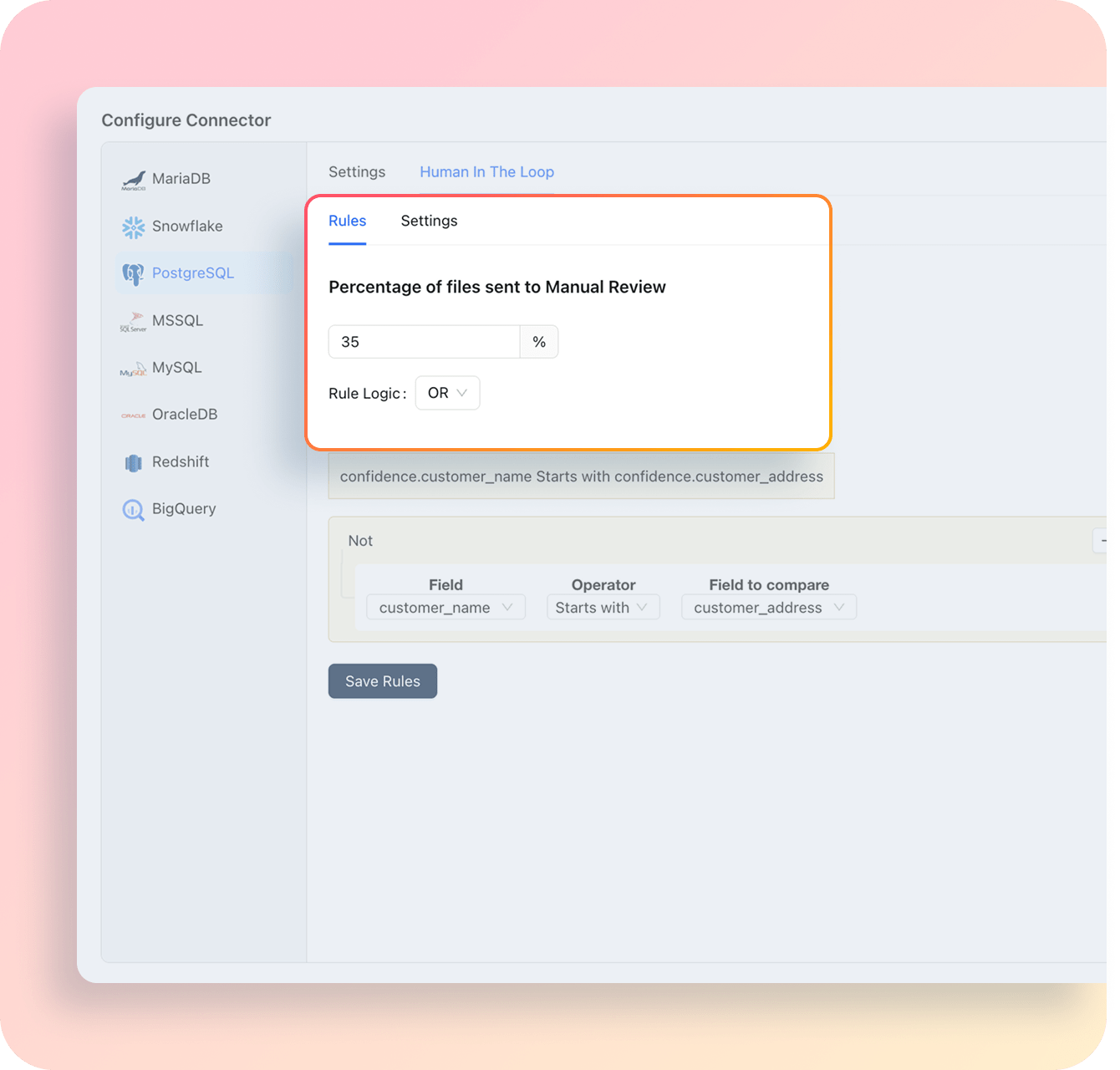 Send a fixed percentage of documents for review every time your workflow runs. Build conditions based on field values or confidence scores. Ensure your team only reviews edge cases while perfect extractions flow through.