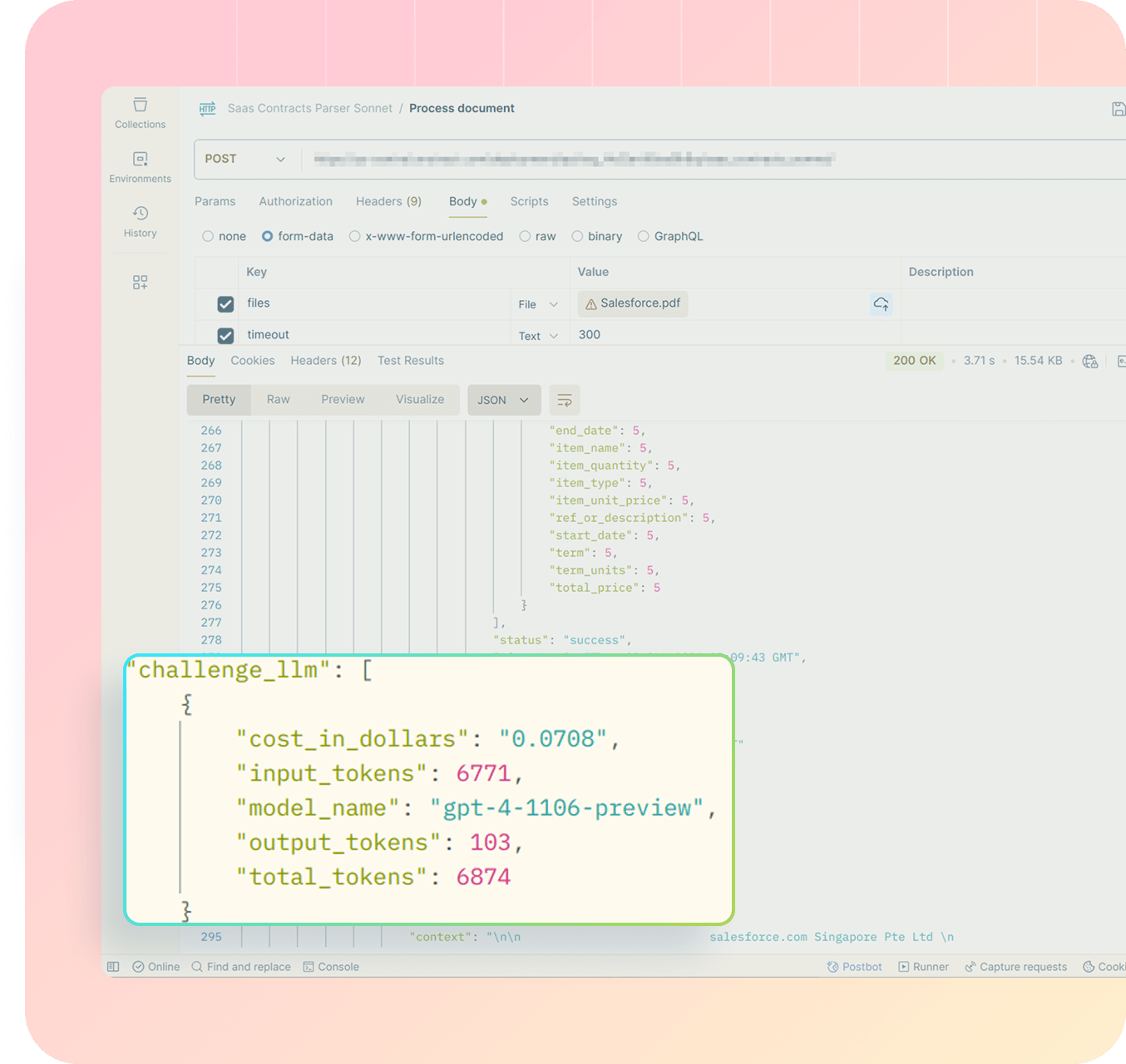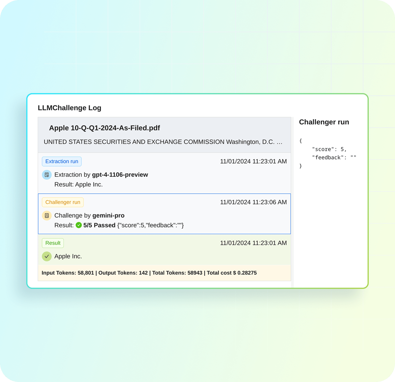 Get drilled-down insights by running the metadata for every extraction. Track token costs, view challenger confidence scores, or debug outputs after deployment.